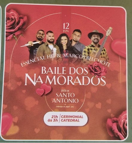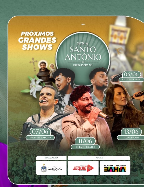 A grade de shows com intérpretes da música católica, no Espaço Dom Cristiano, em frente a Catedral de Santo Antonio – Padroeiro de Jequié, será aberta na noite desta sexta-feira (6), com a dupla Ramon e Rafael; no sábado (7), será William Safona; no dia 11 será o show de Thiago Brado. No dia 12 será realizado no Cerimonial Catedral, o Baile dos Namorados, com a banda Essencial Hits e o cantor Belchoti; no dia 13, a programação será encerrada com a cantora Aline Brasil.