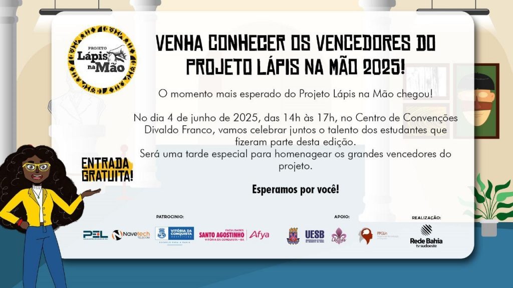Nesta quarta-feira (4), a partir das 14h, acontece a premiação do Projeto Lápis na Mão, promovido pela TV Sudoeste, em parceria com a Prefeitura de Vitória da Conquista. A cerimônia será realizada no Centro de Convenções Divaldo Franco, situado na Avenida Rosa Cruz, 1035, bairro Alto Maron.