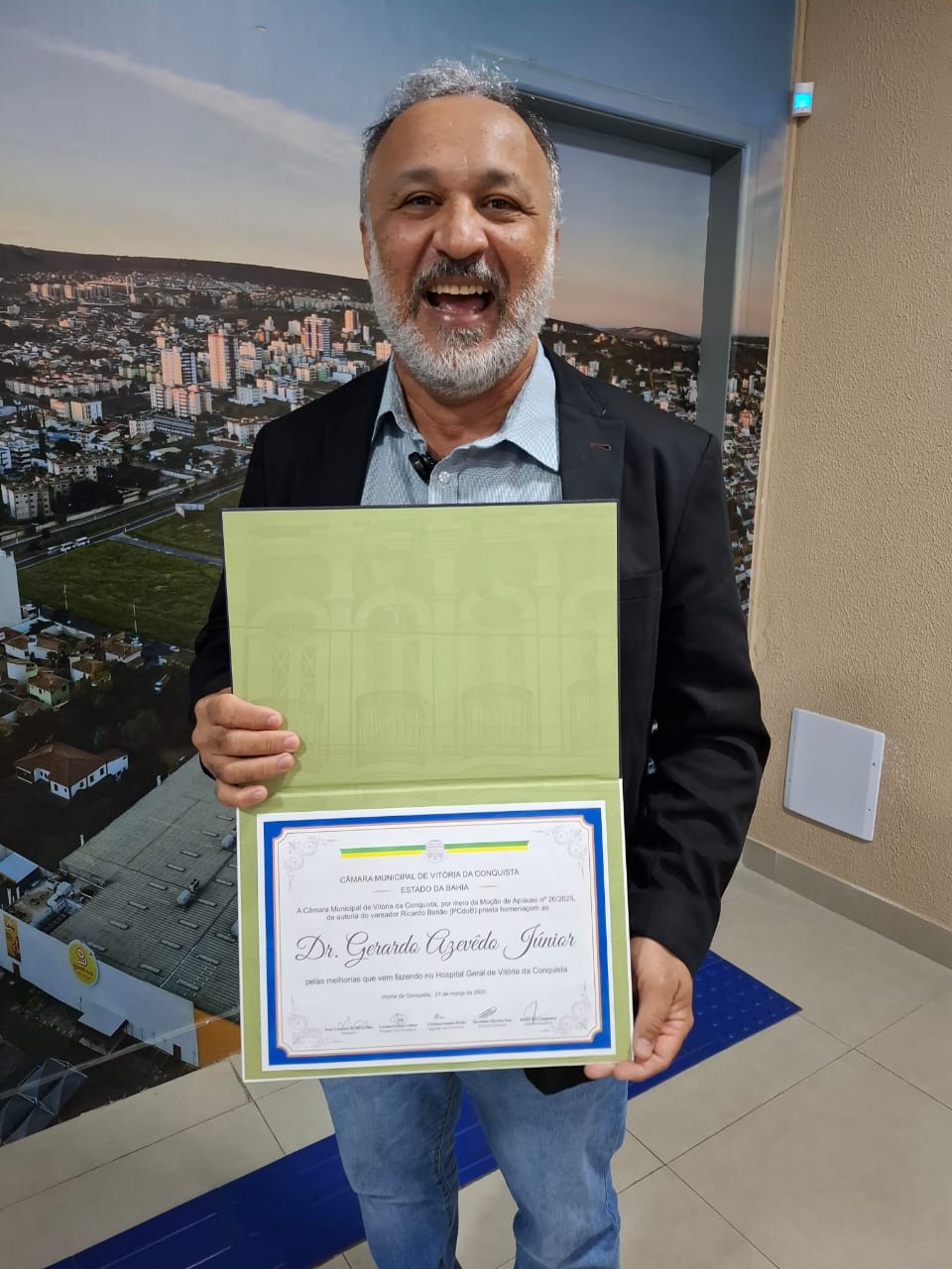 O diretor do Complexo Hospitalar de Vitória da Conquista, Gerardo Azevêdo Júnior, foi homenageado com uma Moção de Aplausos durante sessão solene na Câmara Municipal de Vereadores. A honraria foi concedida por indicação do vereador Ricardo Babão, em reconhecimento ao trabalho relevante prestado por Gerardo na área da saúde no município.