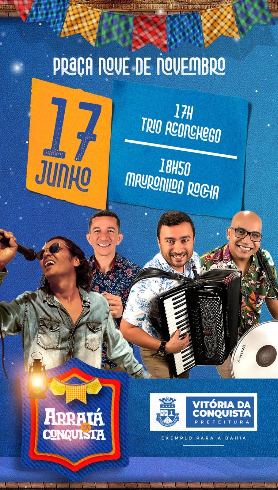 Hoje, a animação do Arraiá da Conquista na Praça Nove de Novembro está por conta do Trio Aconchego, formado por Leo Callegari, Ronam Moreno e Vitor Mariá, às 17h, e, em seguida, Mauronildo Rocha, cantor que apresenta um repertório musical repleto de xote, baião e arrasta-pé para todas as idades, que promete agitar o público com sua apresentação contagiante.