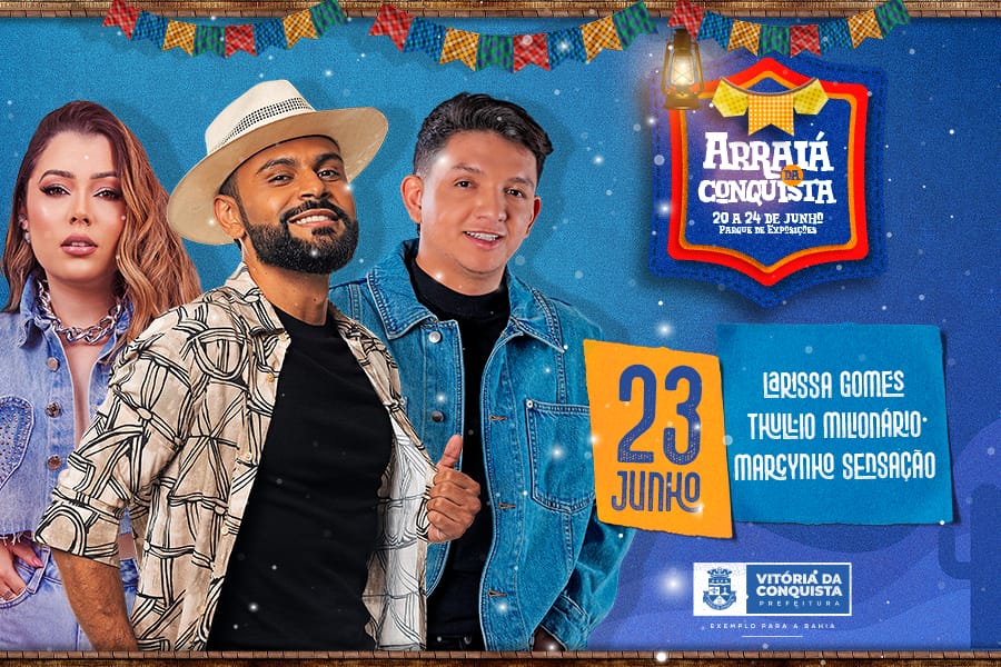 A festa continua no Parque de Exposições Teopompo de Almeida, com o Arraiá da Conquista, nesta segunda-feira (23). Sobem ao palco principal Jobim Araújo, Jô Almeida, Túlio Milionário, Larissa Gomes e Marcynho Sensação. A entrada é gratuita e os portões estarão abertos a partir das 18h.