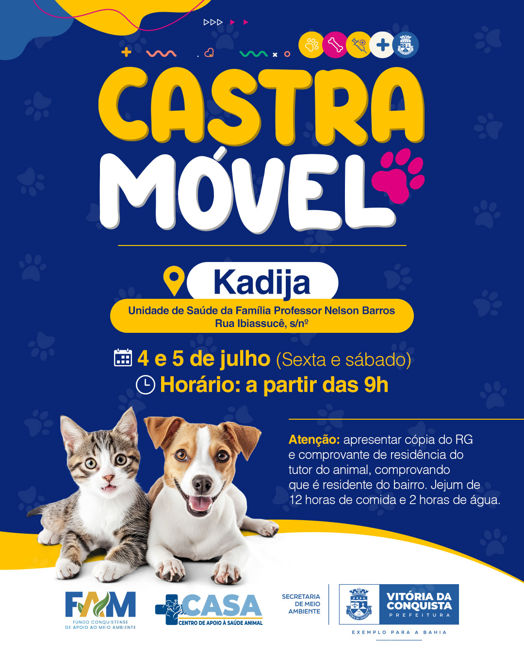 A unidade móvel do Centro de Apoio à Saúde Animal (Casa), o Castramóvel, está de volta! Após um ano de atividades levando saúde e bem-estar para os animais de Vitória da Conquista, o serviço retornará nesta sexta-feira (4), a partir das 9h, na Unidade de Saúde da Família Nelson Barros, localizada na Rua Ibiassucê, S/N, Kadija. As castrações também serão realizadas no sábado (5).