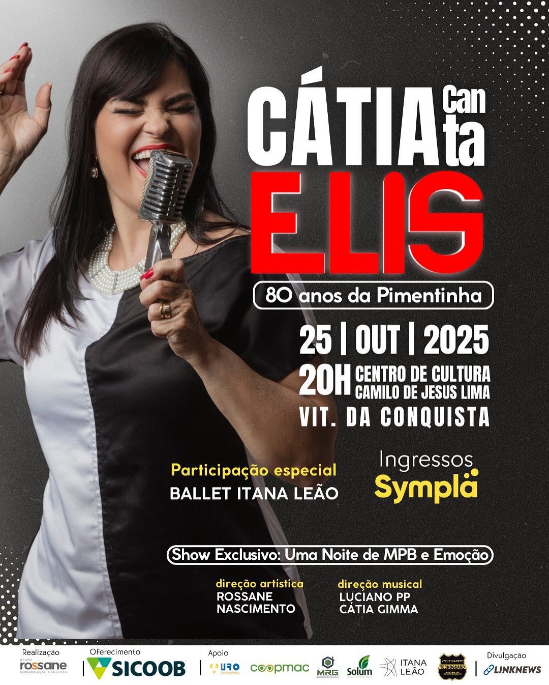 Vitória da Conquista, 25 de outubro. A cantora baiana Cátia Guimma, reconhecida nacional e internacionalmente como uma das maiores intérpretes do axé music, prepara-se para uma apresentação inédita que promete emocionar o público. No espetáculo “Cátia canta Elis Regina: 80 anos da Pimentinha”, a artista preserva seu tradicional repertório de axé para homenagear uma das vozes mais icônicas da música brasileira, Elis Regina.