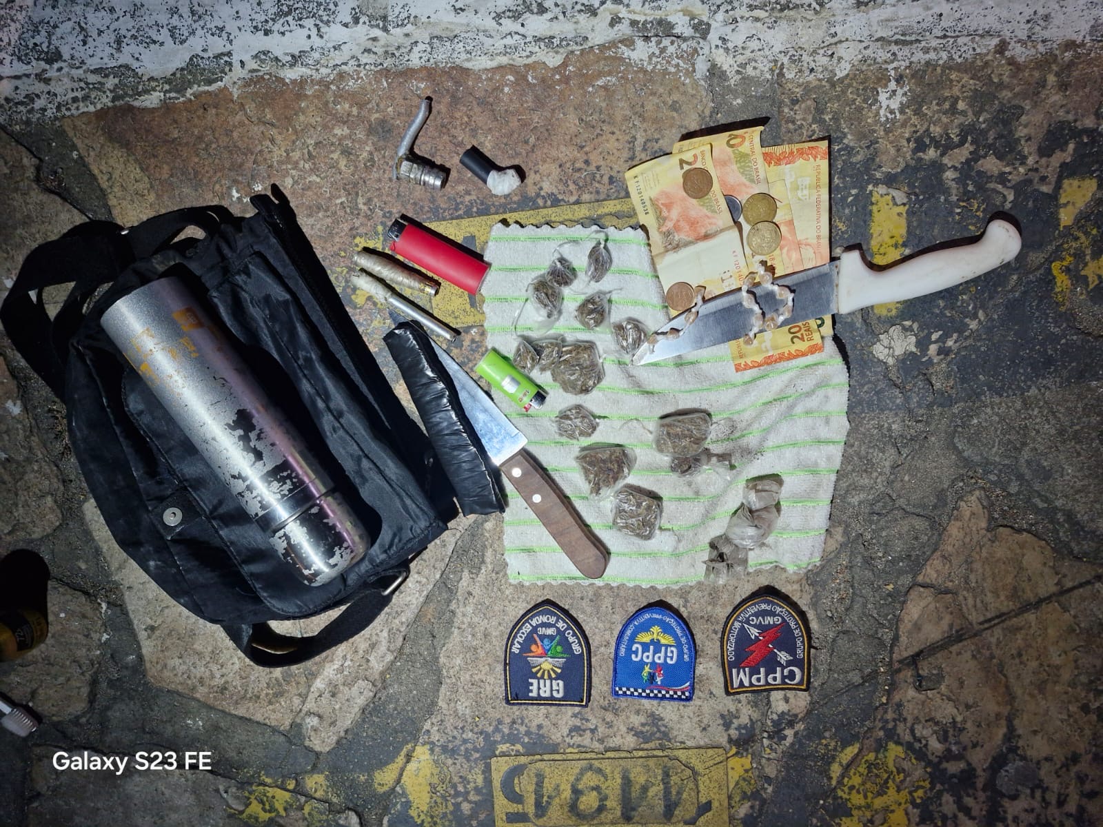 Na abordagem, os agentes apreenderam entorpecentes e facas, aumentando a gravidade da situação. O material recolhido foi encaminhado às autoridades competentes para os devidos procedimentos legais.