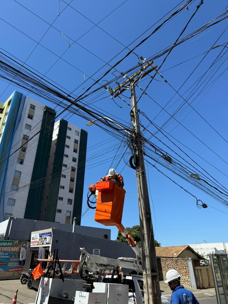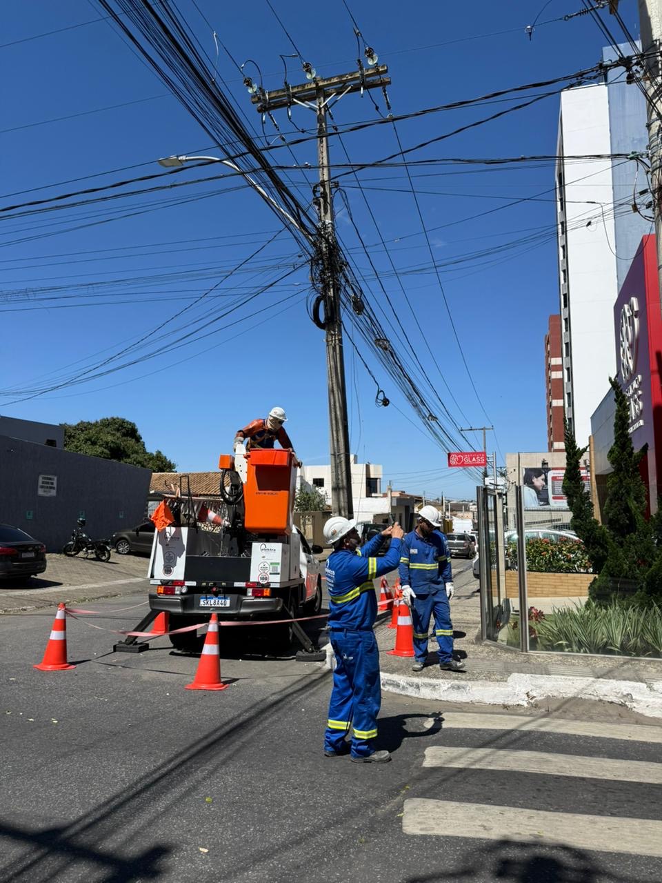Na manhã desta terça-feira (30), equipes da Coelba realizaram a retirada de fios de postes nas proximidades da Praça Orlando Leite, em Vitória da Conquista.