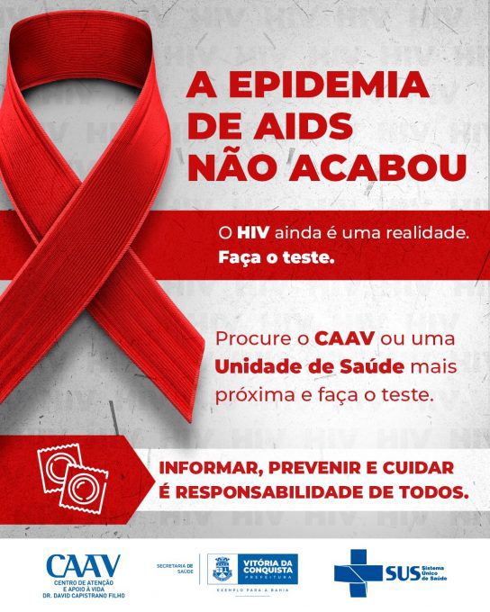 Em Vitória da Conquista, a Secretaria Municipal de Saúde (SMS), por meio do Centro de Atenção e Apoio à Vida (Caav), realiza todos os anos a campanha em alusão ao Dia Mundial de Luta contra a Aids, que é comemorado em 1º de dezembro. Com o tema “A epidemia de Aids acabou”, o objetivo principal da campanha é fazer o diagnóstico precoce e sensibilizar sobre o uso do preservativo em todas as relações sexuais, bem como manter os pacientes já diagnosticados em uso regular da Terapia Antirretroviral (Tarv).