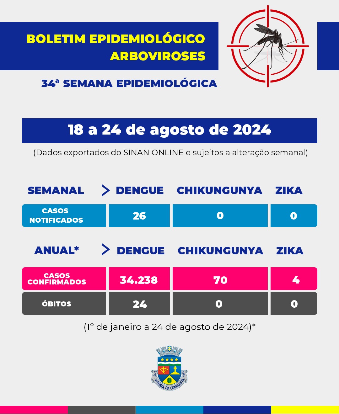 A Secretaria Municipal de Saúde (SMS) publicou, nesta terça-feira (27), o boletim epidemiológico referente à 34ª semana epidemiológica, que abrange o período de 18 a 24 de agosto. Durante essa semana, foram reportados 26 casos suspeitos de dengue. Não houve registro de suspeitas de chikungunya ou zika, e o município permanece sem óbitos associados a essas doenças desde 8 de julho.
