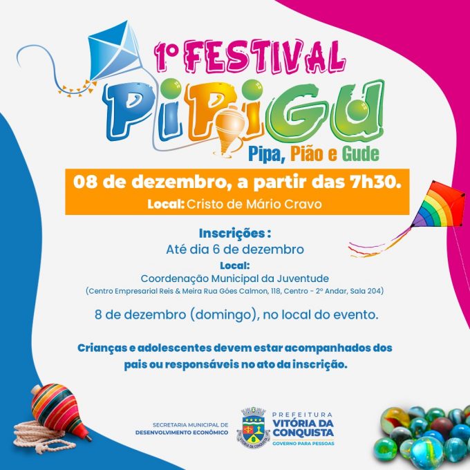 A manhã deste domingo (8) será de muito entretenimento para as famílias que vão participar do Festival Pipa, Pião e Gude (Pipigu), que será realizado na área do Cristo pela Coordenação Municipal da Juventude, ligada à Secretaria Municipal de Desenvolvimento Econômico. O encontro será das 7h30 às 12h e promoverá a integração de pessoas de diferentes gerações, desde as crianças a partir dos 7 anos de idade.