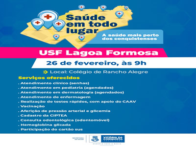 O projeto Saúde em Todo Lugar, realizado pela Prefeitura de Vitória da Conquista, por meio da Secretaria Municipal de Saúde (SMS), chega nesta quarta-feira (26) ao povoado Lagoa Formosa, distrito de Iguá. A iniciativa visa ampliar os atendimentos já ofertados pela Unidade de Saúde da Família da localidade, com oferta de diversos serviços na área de saúde.