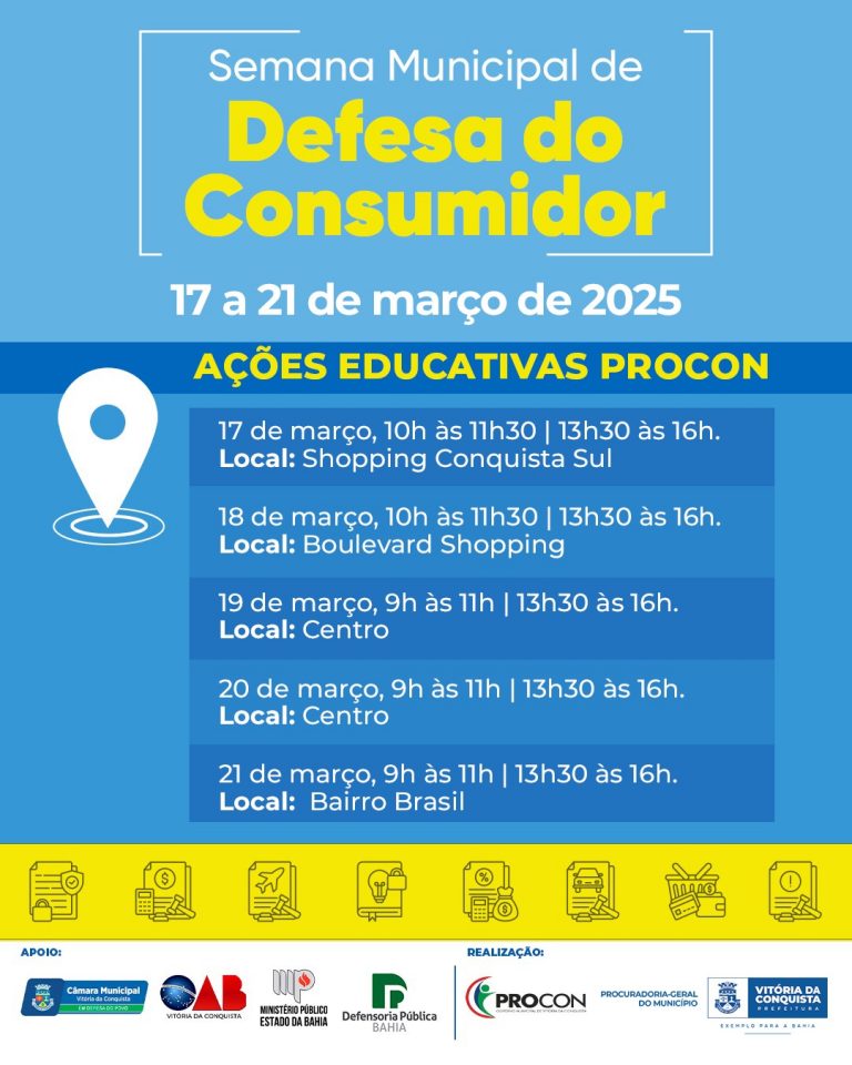 A Prefeitura de Vitória da Conquista, por meio da Procuradoria-Geral do Município e da Superintendência Municipal de Proteção e Defesa do Consumidor (Procon), realiza de 17 a 21 de março, a Semana Municipal de Defesa do Consumidor. A ação integra o Calendário Oficial do Município desde 2017, por meio da Lei Municipal nº 2.122/2017, que estabelece que o evento deve ocorrer a partir do dia 15 de março, data que marca o Dia do Consumidor, e reforça a importância de garantir os direitos dos consumidores e o cumprimento das normas que regem as relações de consumo.