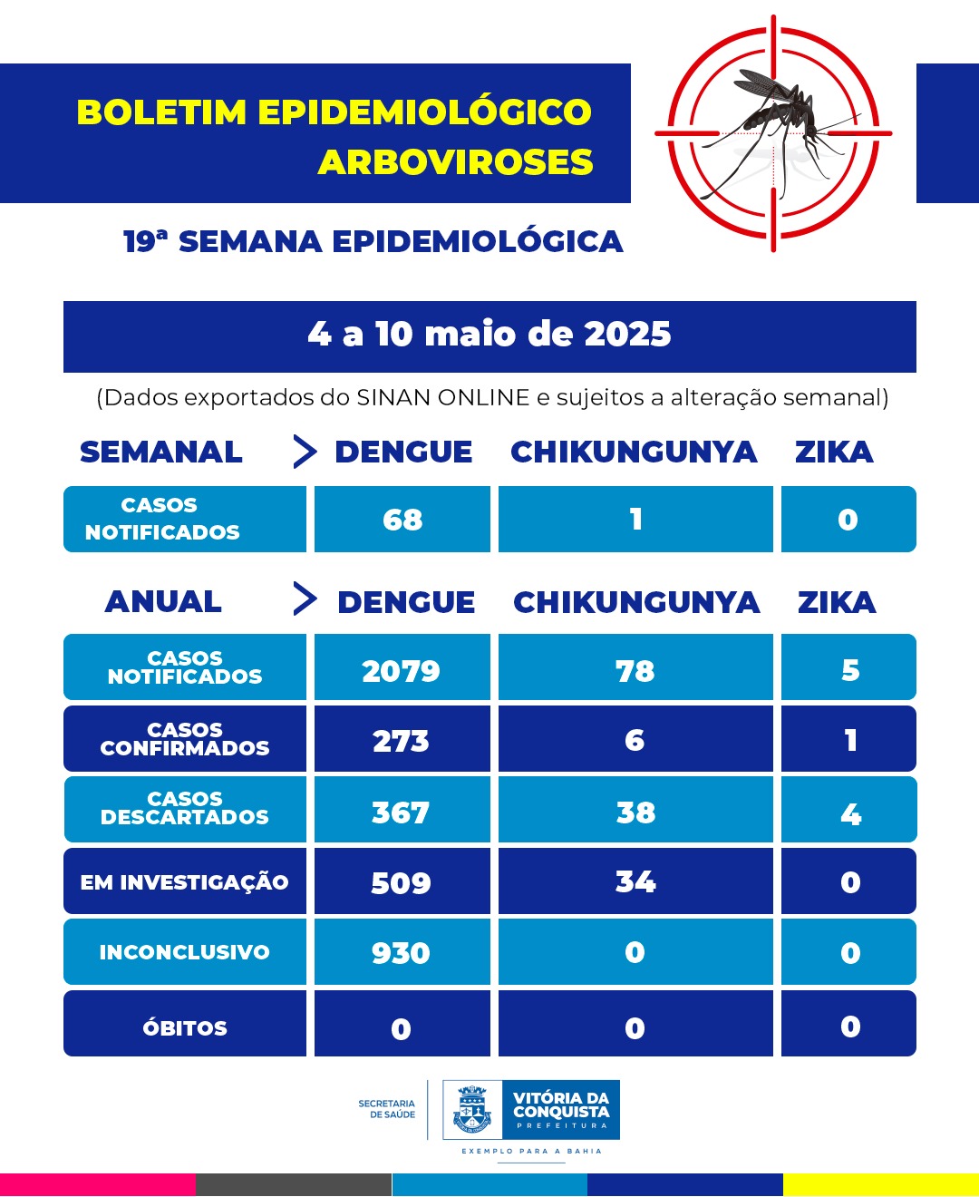 Vitória da Conquista registrou de 4 a 10 de maio, durante a 19ª Semana Epidemiológica, 68 casos suspeitos para dengue e um para chikungunya. Neste período, três pessoas foram internadas na rede hospitalar da cidade por conta da dengue. As informações são do Sistema Nacional de Notificação (Sinan).