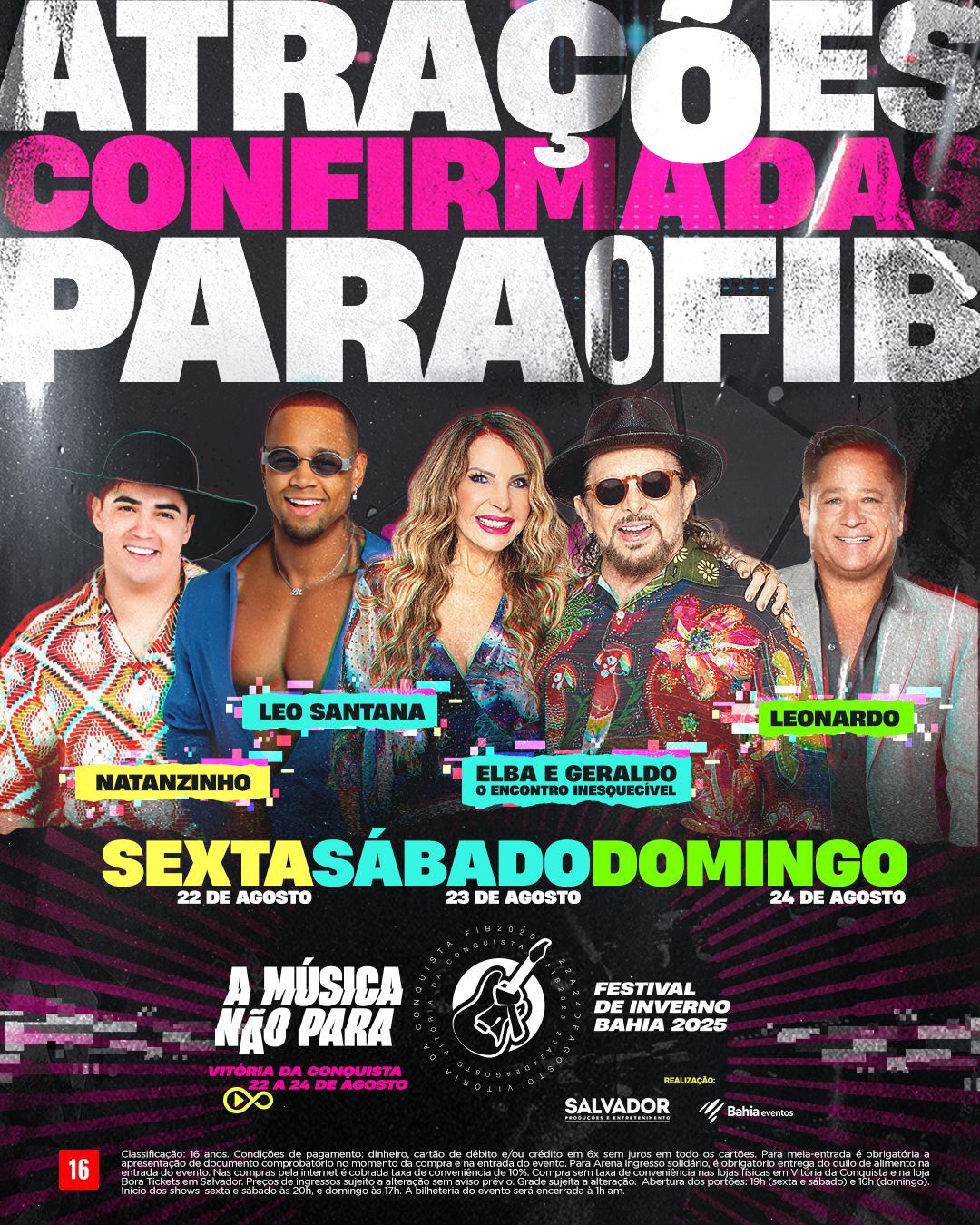 Depois de confirmar as primeiras atrações da edição de 2025, o Festival de Inverno Bahia (FIB) acaba de anunciar outros nomes que irão celebrar as 19 edições do festival, entre os confirmados estão o GG Léo Santana, Natanzinho Lima, Leonardo e um encontro pra lá de especial dos cantores Elba Ramalho e Geraldo Azevedo. Além deles, Ivete Sangalo, Matuê e Ney Matogrosso também estarão na grade do FIB, que acontecerá nos dias 22, 23 e 24 de agosto, no Parque de Exposições Teopompo de Almeida, em Vitória da Conquista – BA.