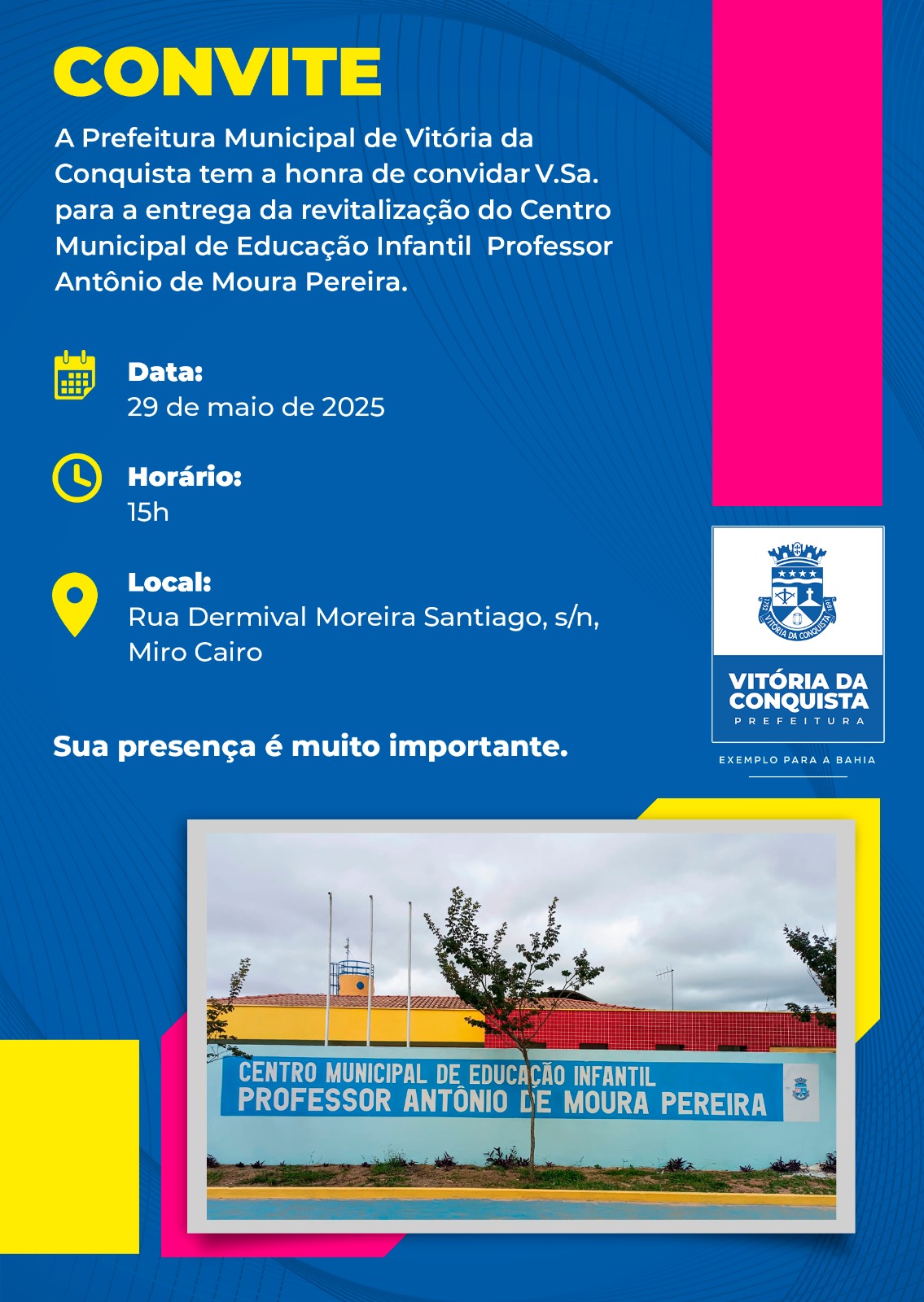 Às 15h, a Prefeitura de Vitória da Conquista entrega a revitalização do Centro de Educação Infantil Professor Antônio de Moura Pereira, situado no loteamento Miro Cairo. Com mais essa entrega, o Governo Municipal totaliza 88 escolas totalmente reformadas e duas construídas da base desde 2021, por meio da Secretaria Municipal de Educação.